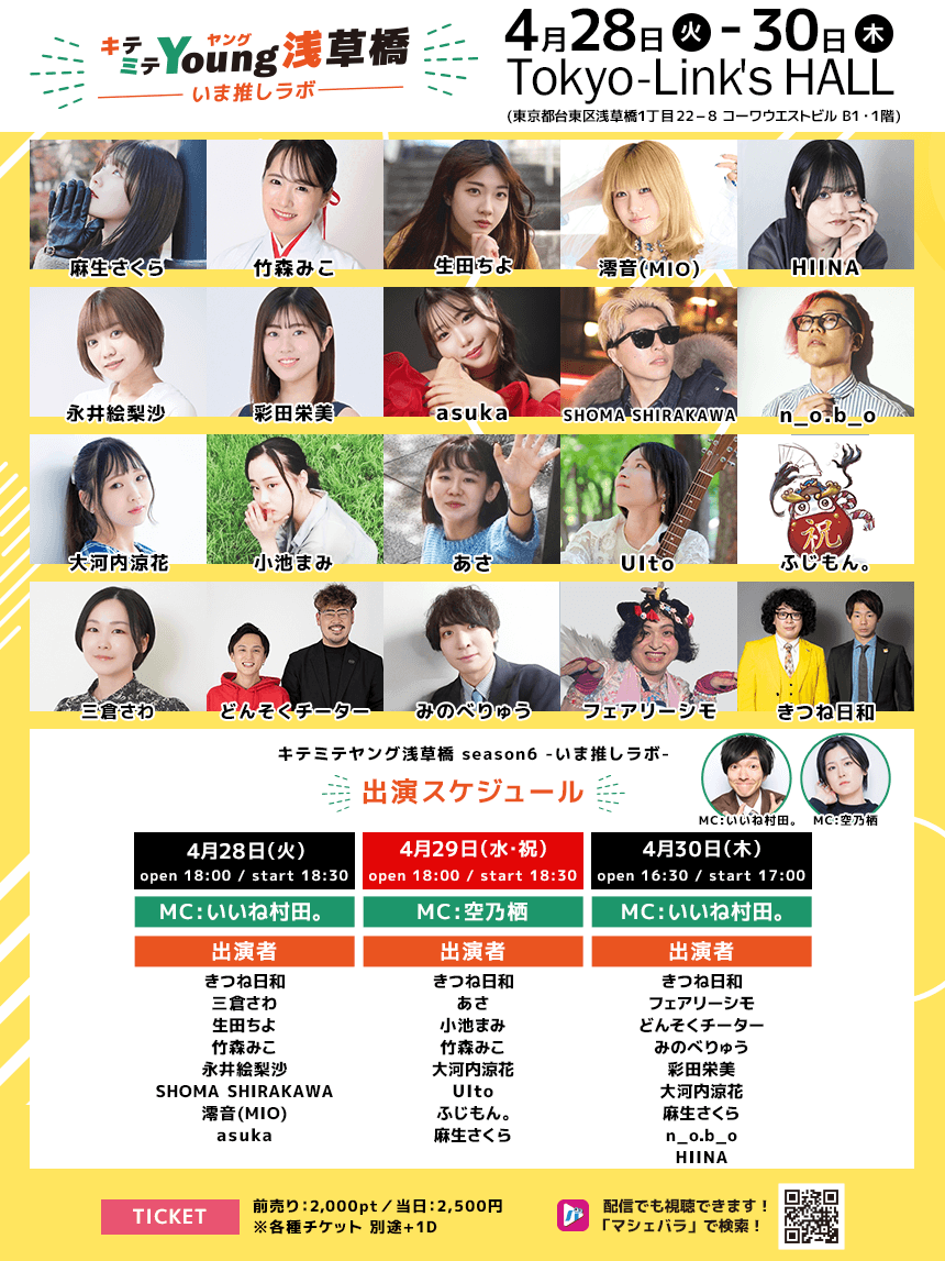 【出演者】 <4月28日(火)> MC:いいね村田。 きつね日和 澪音(MIO) 竹森みこ 永井絵梨沙 生田ちよ SHOMA SHIRAKAWA asuka 三倉さわ <4月29日(水・祝) > MC:空乃栖 きつね日和 大河内涼花 竹森みこ 麻生さくら あさ 小池まみ UIto ふじもん 愛生 <4月30日(木)> MC:いいね村田。 きつね日和 麻生さくら HIINA 大河内涼花 彩田栄美 n_o.b_o(n_o.b_o) フェアリーシモ どんそくチーター みのべりゅう |