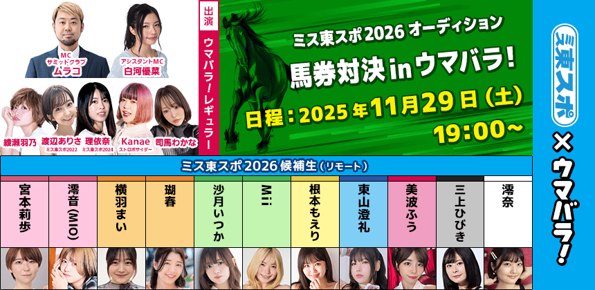 11月29日(土)開催 ミス東スポ2026オーディション馬券対決inウマバラ!のお知らせ