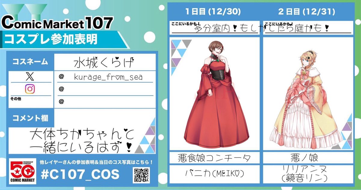 冬コミ参加します🫶 1日目、2日目、どちらもボカロで固めました🙏🏻✨ リリアンヌは黒ドレスverで参加します〜❣️ #コミケ107 #コミックマーケット107 #C107_cos #コミケ参加表明 #コスプレイヤーさんと繋がりたい お会いできる方居たら嬉しいです❣️ https://t.co/opCuQ43XiY