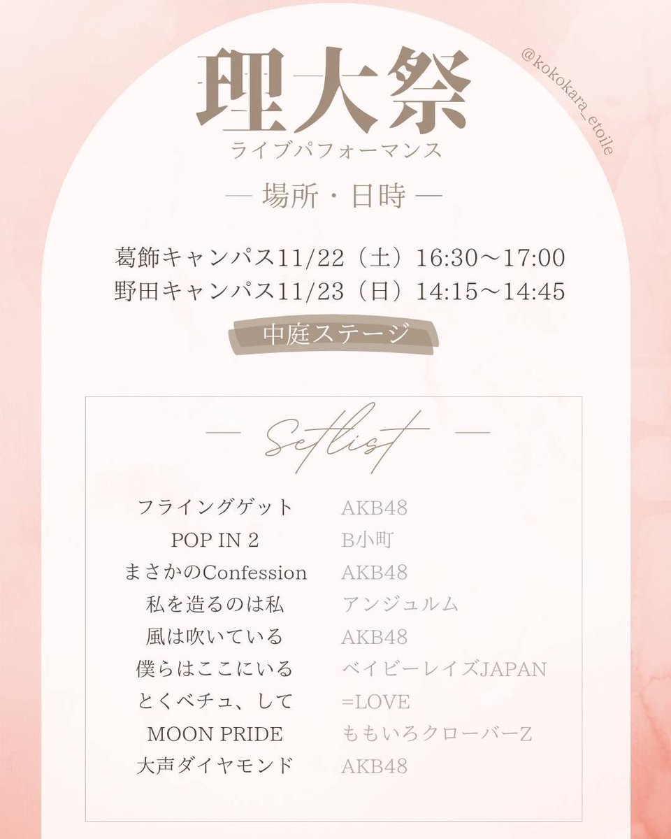 🌟お知らせ🌟 理大祭に出演させていただきます💫 〈日時・場所〉 11/22(土)16:30〜17:00@葛飾キャンパス中庭ステージ 11/23(日)14:15〜14:45@野田キャンパス中庭ステージ セットリスト、出演メンバーは画像をご覧ください💓 ※ねうは23日のみの出演になります🙇♀️ https://t.co/mEcaTRXFNM