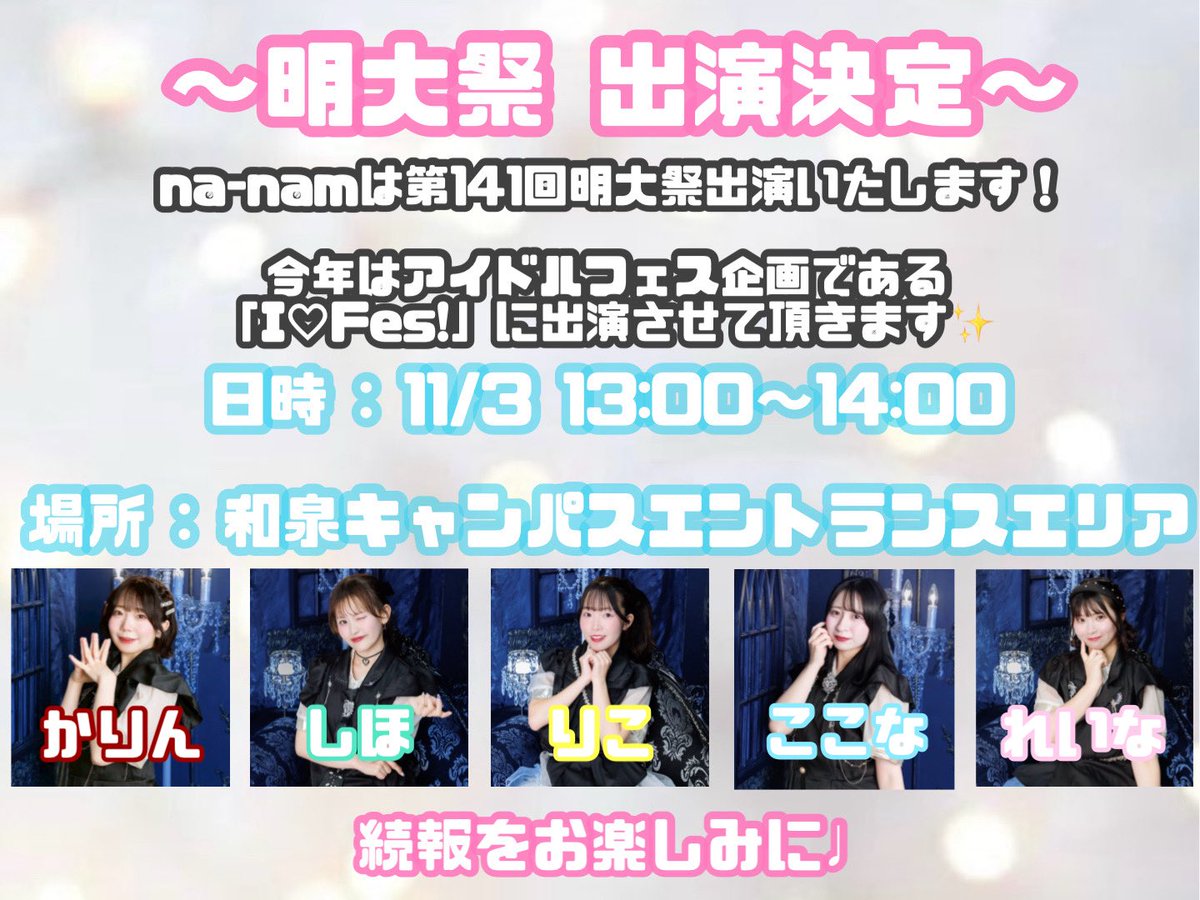 🌈 満員御礼 🌈 第141回明大祭 「I♡Fes!」に出演させて頂きました!!沢山の声援本当にありがとうございました🎀💘 引き続きna-namの応援よろしくお願いいたします!✨️ https://t.co/4HmrTyNiRP