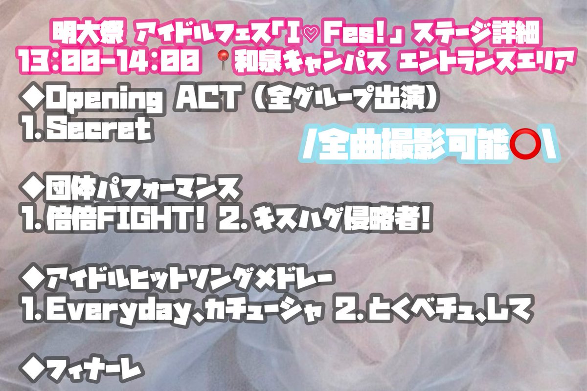 💠 明日開催の明大祭について 💠 明日13:00〜明大祭アイドルフェス 「I♡Fes!」に出演させていただきます♡ 全5曲披露予定です🌈✨️ セットリストや出演コンテンツについての詳しい情報は以下画像をご覧下さい! たくさんの方のご来場 お待ちしております🎀 https://t.co/0fefL33oxq https://t.co/cLIp5OjOVe